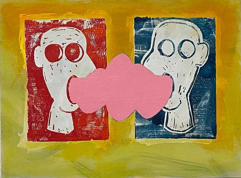 BLOCK PRINT AND ACRYLIC PAINT ON PAPER