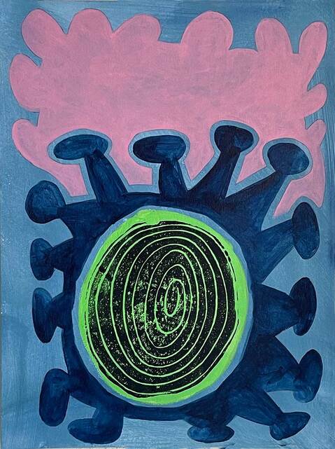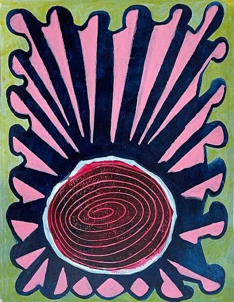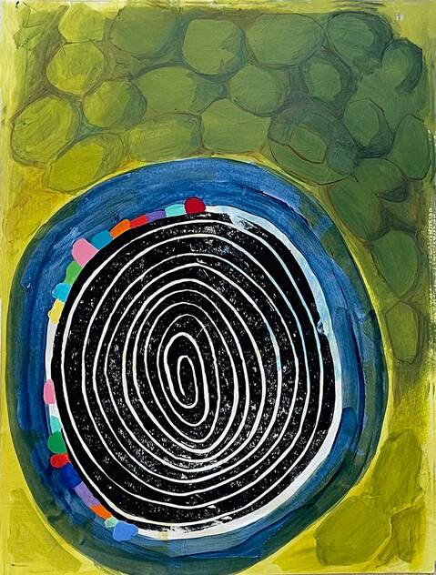 ACRYLIC, SHARPIE PEN AND BLOCK PRINT ON PANEL