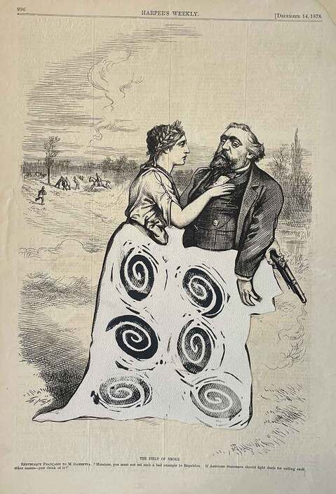 ACRYLIC AND BLOCK PRINT ON FOUND PAPER